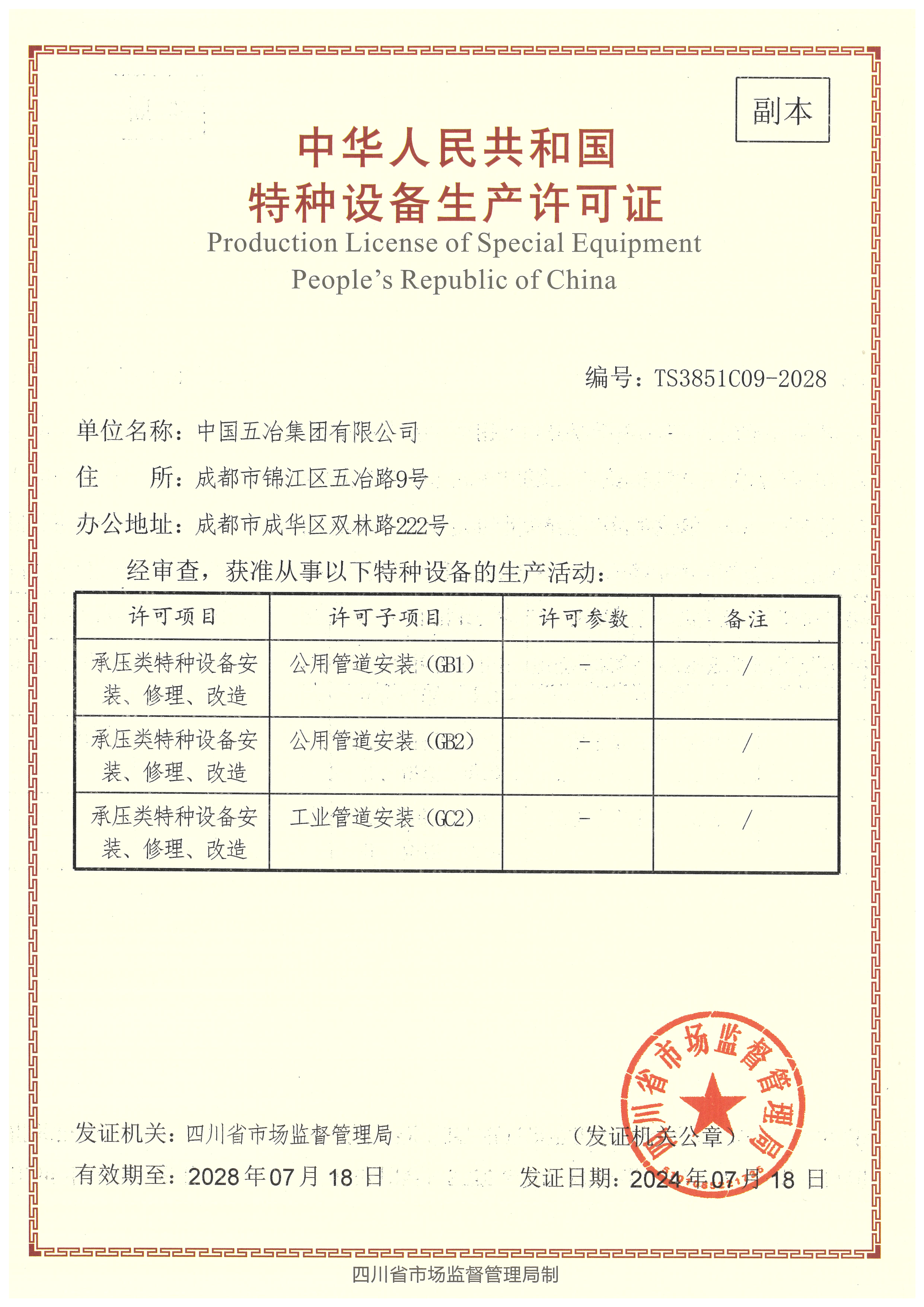 特種設(shè)備生產(chǎn)許可證(管道安裝)