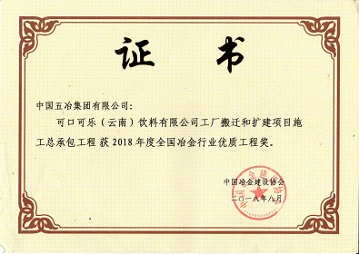 可口可樂(云南)飲料有限公司工廠搬遷和擴建項目施工總承包安裝工程-2018年度全國冶金行業(yè)優(yōu)質(zhì)工程獎