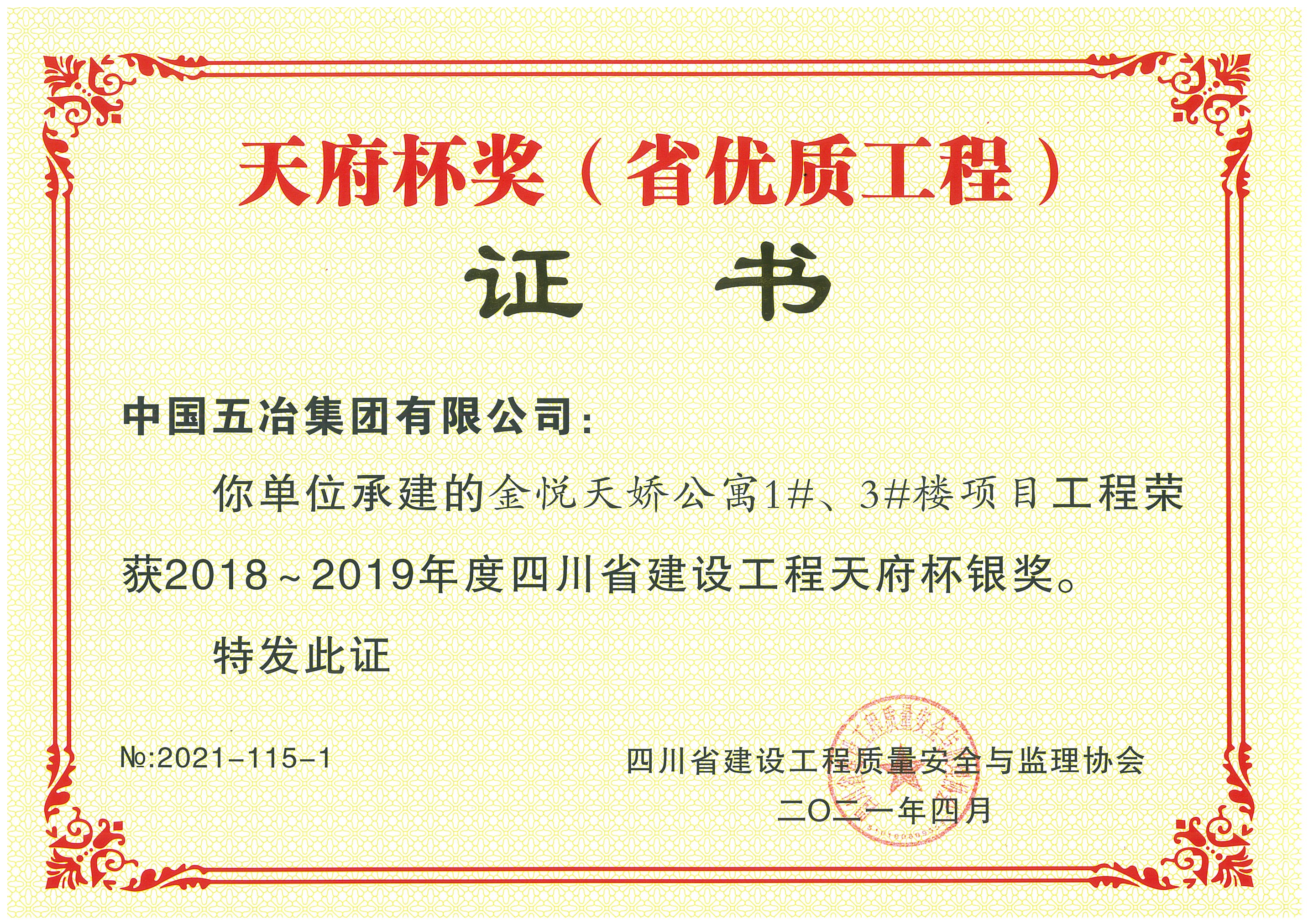 金悅天嬌公寓1#、3#樓項(xiàng)目-2018-2019年度四川省天府杯銀獎(jiǎng)