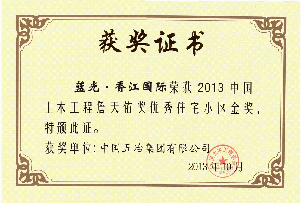 ????2013年10月,中國(guó)五冶集團(tuán)有限公司藍(lán)光·香江國(guó)際項(xiàng)目榮獲2013年度中國(guó)土木工程詹天佑獎(jiǎng)優(yōu)秀住宅小區(qū)金獎(jiǎng)。
