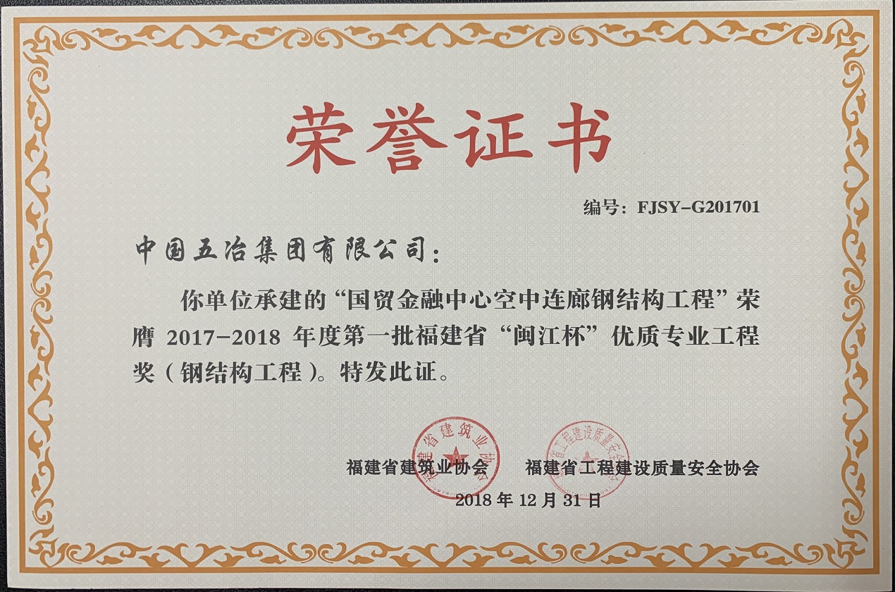 “國貿(mào)金融中心空中連廊鋼結(jié)構(gòu)工程”榮獲2017—2018年度第一批福建省“閩江杯”優(yōu)質(zhì)專業(yè)工程獎(jiǎng)(鋼結(jié)構(gòu)工程)
