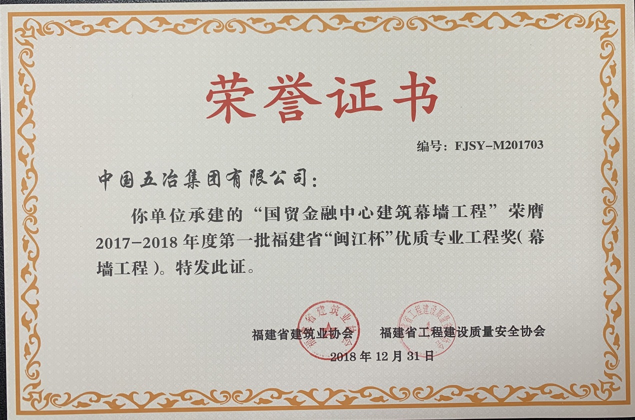 國貿金融中心建筑幕墻工程榮獲2017—2018年度第一批福建省“閩江杯”優(yōu)質專業(yè)工程獎(幕墻工程)
