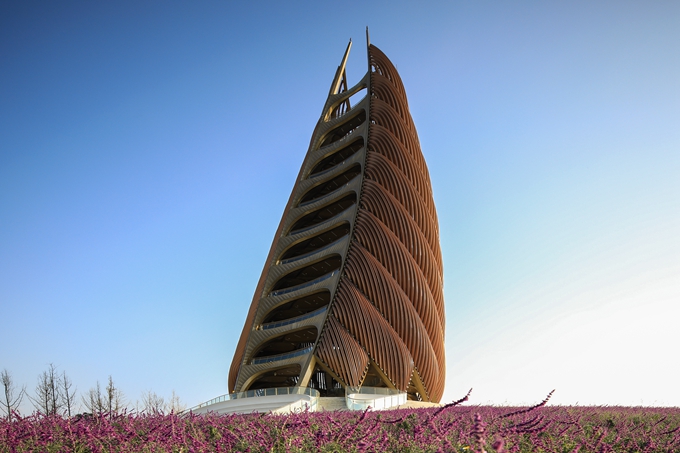 同時(shí),為最大程度模擬“春筍”表面的紋理與脈絡(luò),在裝飾裝修階段,項(xiàng)目團(tuán)隊(duì)共采用了近672根單曲不重復(fù)的弧形月牙格柵來(lái)編織“春筍”的全曲面幕墻外衣,每一根格柵的大小、形狀都不一樣,最大的一根格柵長(zhǎng)度達(dá)13.688米,自重超600公斤,所有格柵必須嚴(yán)密對(duì)應(yīng),每一根格柵和指定位置的偏差必須控制在3毫米內(nèi),為此項(xiàng)目團(tuán)隊(duì)采用BIM技術(shù)來(lái)實(shí)現(xiàn)精密“織衣”:運(yùn)用全站儀將各編號(hào)關(guān)鍵點(diǎn)進(jìn)行測(cè)放,確定不同軸間每根月牙格柵連接件的坐標(biāo)、軸線等關(guān)鍵定位點(diǎn),保證安裝就位精度。與此同時(shí),為了更好地還原“春筍”景觀,觀光瞭望塔在噴漆著色等細(xì)節(jié)處理上也頗有講究,其外部格柵為淺褐色,在夕陽(yáng)下泛起淡紅帶金的光澤,配合上包裹著金色GRP材料的鋼結(jié)構(gòu)框架,生動(dòng)地以建筑呈現(xiàn)出自然之美。