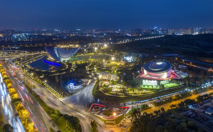 據(jù)項目設計經(jīng)理張敏介紹,“金海螺”外墻采用了雙層設計,最外層是帶有圓孔的鋁單板,可呈現(xiàn)透光效果,加上頂部透光設計,保證了充足的光線照射,白天完全不必開燈。夜幕降臨,“金海螺”可以呈現(xiàn)紅色、藍色、紫色、粉色等柔和漸變,絢麗非凡。未來的成都露天音樂公園里,主舞臺穹頂天幕、“海螺”造型演奏廳、“蝴蝶”游客中心、自然生態(tài)景觀、古琴臺、音樂噴泉、川派盆景“高山流水”和諧呼應,必將引爆市民朋友圈。