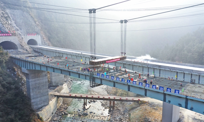 項(xiàng)目鋼結(jié)構(gòu)技術(shù)負(fù)責(zé)人黃治銘介紹,項(xiàng)目所處高山峽谷地帶地勢(shì)陡峭,無法提供大型起吊設(shè)備進(jìn)入施工現(xiàn)場(chǎng)的通道,加之大橋下方的平通河河道狹窄,傳統(tǒng)的機(jī)械吊裝和船只運(yùn)輸將對(duì)河流生態(tài)帶來破壞?!白罱K,考慮到大橋特殊的地理環(huán)境,施工團(tuán)隊(duì)研發(fā)了國內(nèi)首創(chuàng)的纜索吊裝懸拼安裝工藝,將大橋分成共計(jì)94節(jié)不同節(jié)段,采用單組60噸、雙組85噸的纜索吊解決垂直與水平運(yùn)輸難題,并借助混凝土梁掛籃施工的思路,運(yùn)用懸挑法對(duì)稱拼裝,實(shí)現(xiàn)20萬套螺栓的100%穿孔,成功完成大橋共計(jì)5525噸鋼結(jié)構(gòu)的安裝任務(wù)?!?/p>